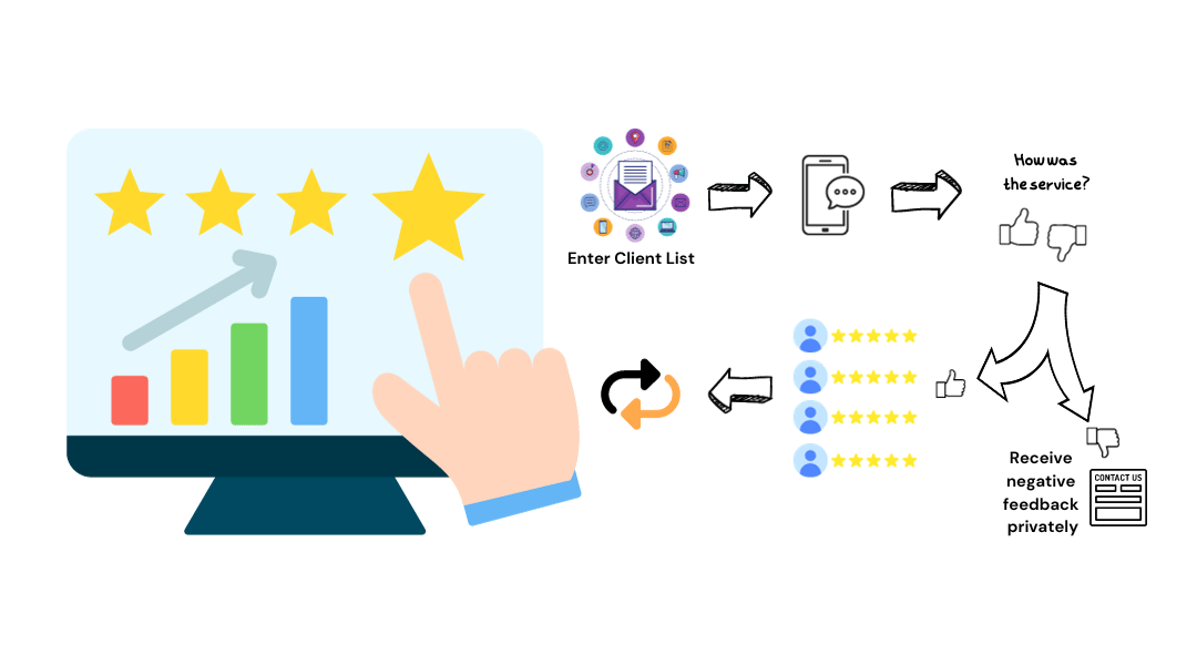 Or one of the best alternatives through utilising a more intelligent online system for reconnect with an existing customer list. We can do this with you by implementing a text message and email marketing strategy to repeat business and even more reviews for your company.